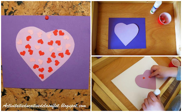 Ca sa continuam in ton cu inimioarele i-am pus la dispozitie o inimioara decupata de catre mine din carton colorat, lipici si niste inimioare micute perforate de catre el anterior. Activitatea a constat in lipirea inimioarelor mici pe inima mai mare, aceasta fiind o alta activitate ce dezvolta motricitatea fina.