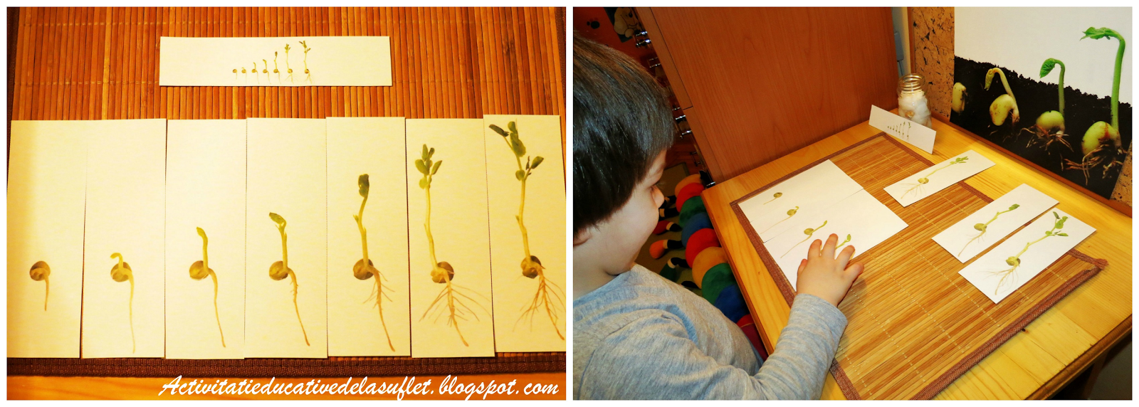 Am printat de aici niste carduri reprezentand stadiile de dezvoltare ale bobului de fasole pe care le-a asezat in ordinea secventiala, avand la dispozitie si cartonasul de referinta.
